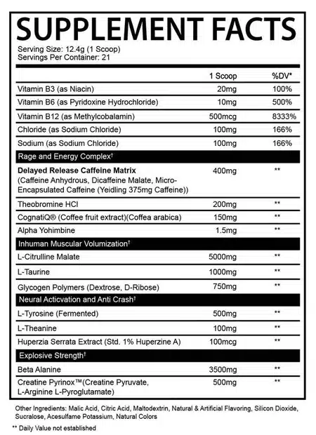 L-Citrulline Malate ; Beta-Alanine ; L-Taurine ; Glycogen Polymers (Dextrose, D-Ribose) ; Delayed-Release Caffeine Matrix (tri-source) ; L-Theanine ; Theobromine ; CognatiQ® (Coffee Arabica fruit extract) ; Alpha-Yohimbine ; Huperzine A ; arômes/acides/édulcorants selon parfum.