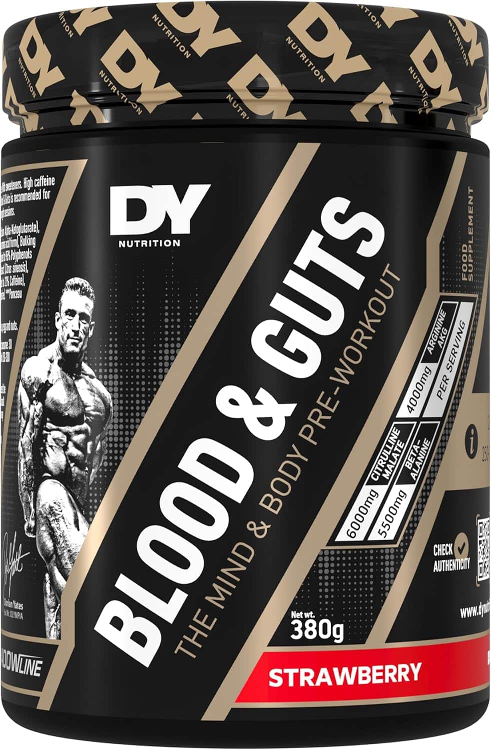 Blood & Guts DY Nutrition est un pre workout conçu pour les pratiquants qui veulent un produit très nerveux avant l’entraînement. La marque le positionne clairement sur l’énergie, la concentration et l’intensité, avec une formule inspirée de l’univers Dorian Yates. On est ici sur un pré-entraînement pensé pour aider à attaquer les grosses séances avec plus de focus, plus de répondant et une sensation de montée en puissance très marquée.
