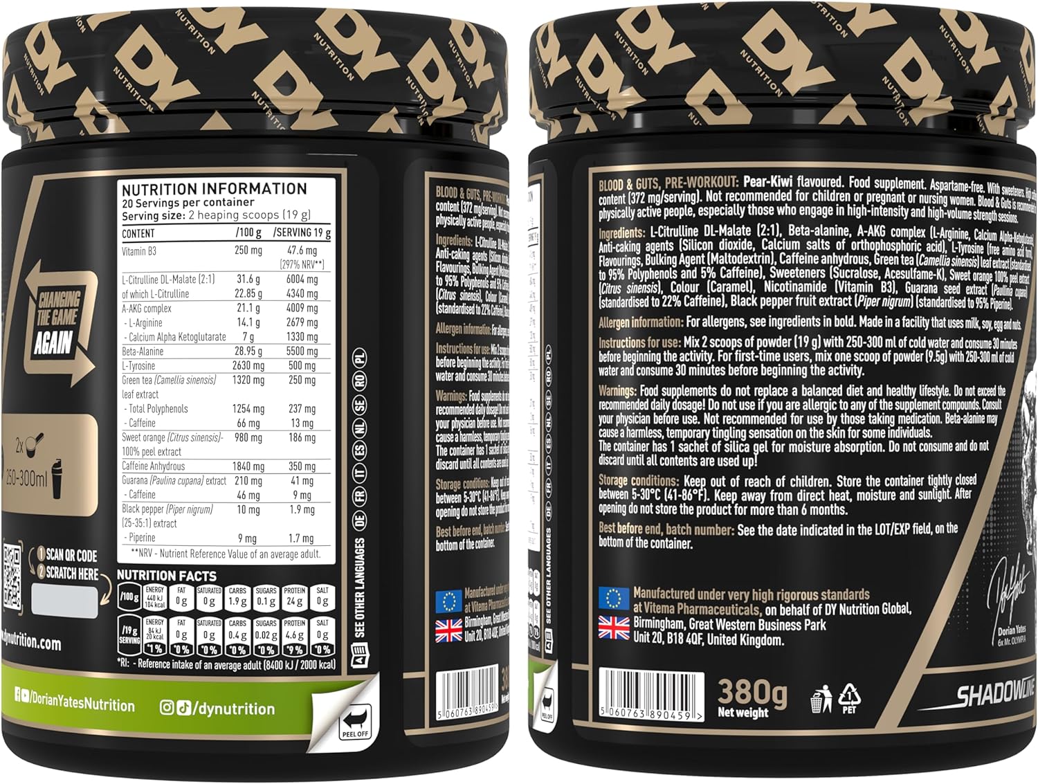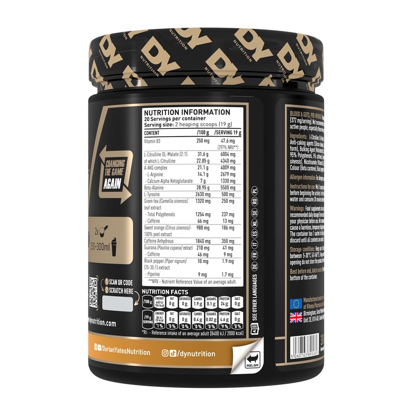 Le vrai point fort de Blood & Guts DY Nutrition, c’est sa formule fortement dosée sur plusieurs axes clés du pre workout. La page fabricant met en avant 6000 mg de citrulline malate, 5500 mg de bêta-alanine, 4000 mg d’arginine AKG, 500 mg de L-tyrosine et 350 mg de caféine par portion. À cela s’ajoutent la vitamine B3 ainsi que plusieurs extraits végétaux. Sur le papier, cela en fait une formule clairement orientée énergie, congestion, endurance et concentration.