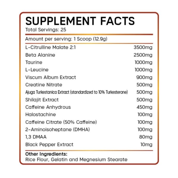 L-citrulline malate 2:1, bêta-alanine, taurine, L-leucine, extrait de Viscum album, créatine nitrate, extrait d’Ajuga turkestanica (turkesterone), extrait de shilajit, caféine anhydre, halostachine, caféine citrate, extrait de poivre noir.