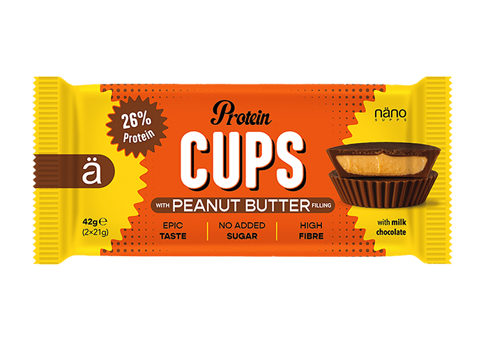 NANO SUPPS PROTEIN CUPS 42 g — coupelles chocolat lait & cœur peanut butter, “no added sugar”, 11 g de protéines par portion.