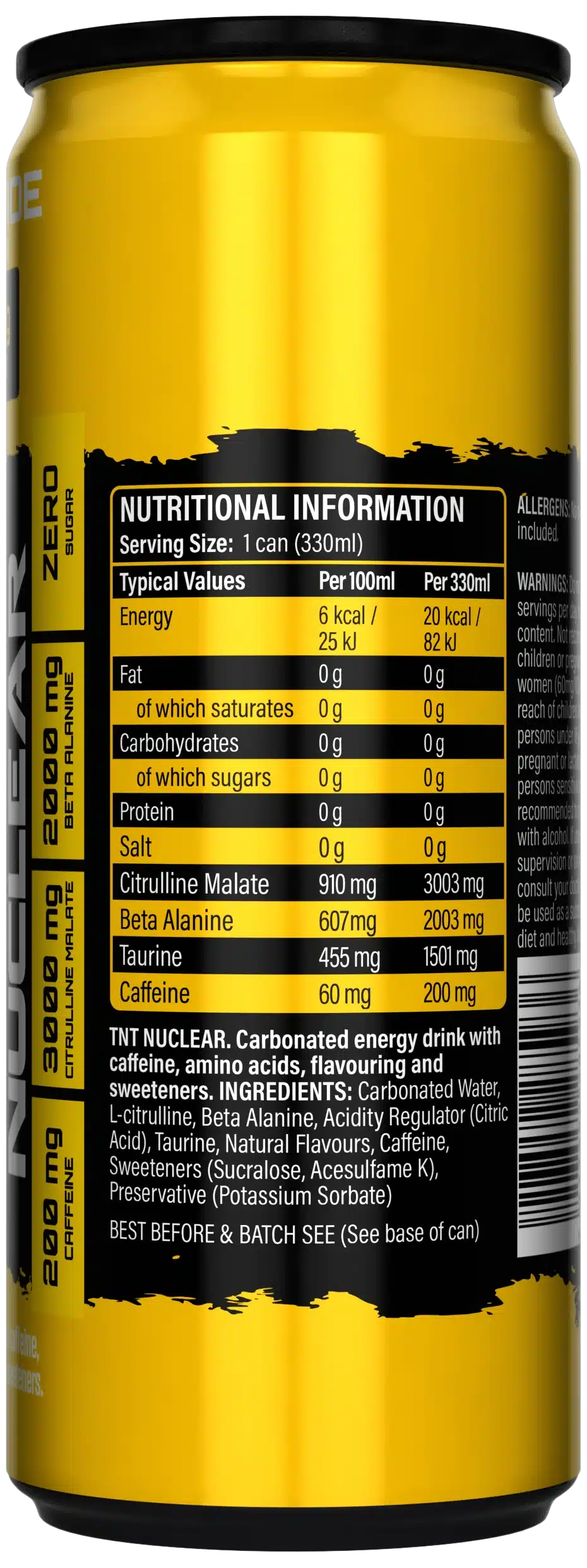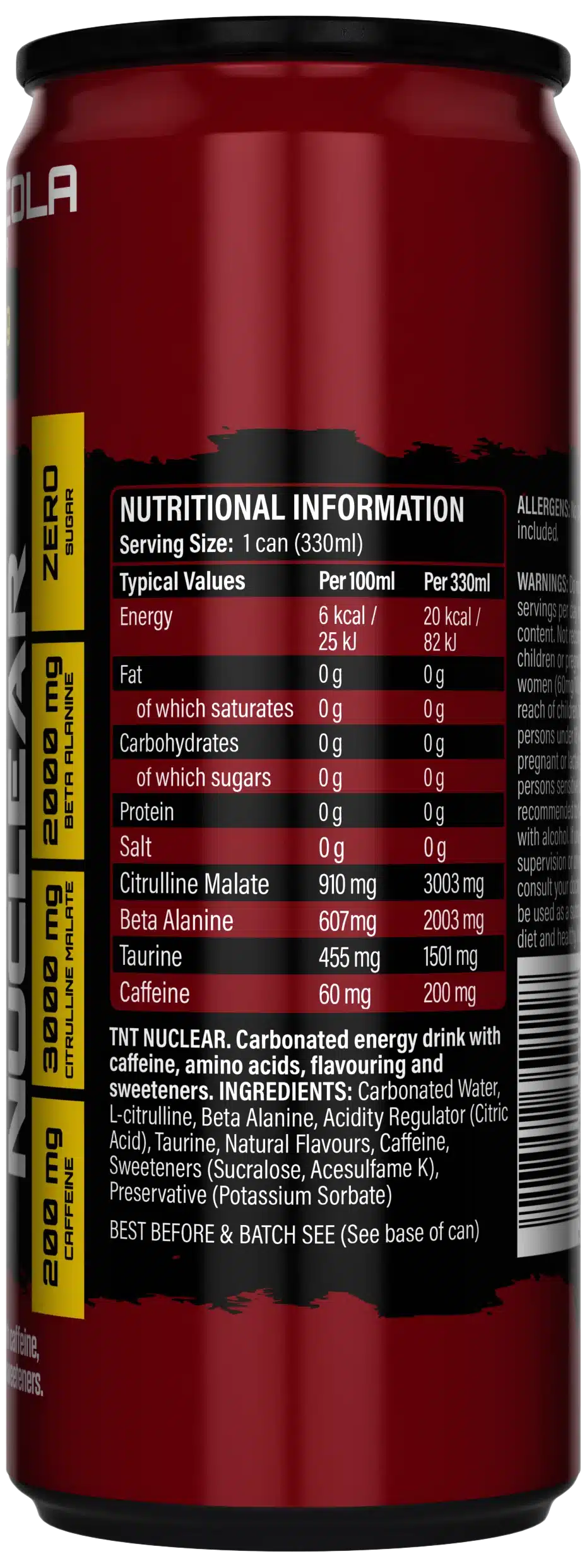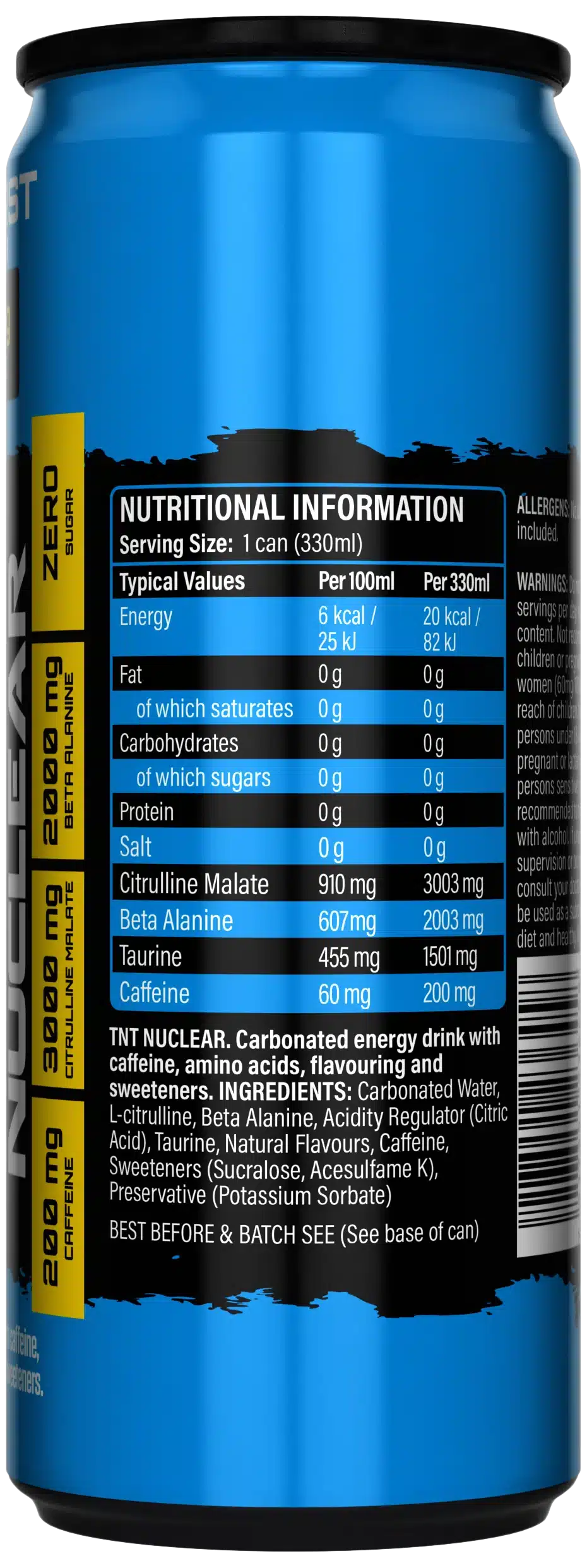 TNT Nuclear 330 ml de NXT Nutrition, c’est le pré-workout prêt à boire quand tu veux du concret, sans shaker, sans dosage, sans prise de tête. Tu ouvres la canette, tu bois, et tu vas t’entraîner avec une formule pensée pour l’essentiel : énergie, focus, endurance et pump. Le gros avantage, c’est la simplicité… et le fait que ça reste sans sucre, avec seulement 20 kcal par canette.