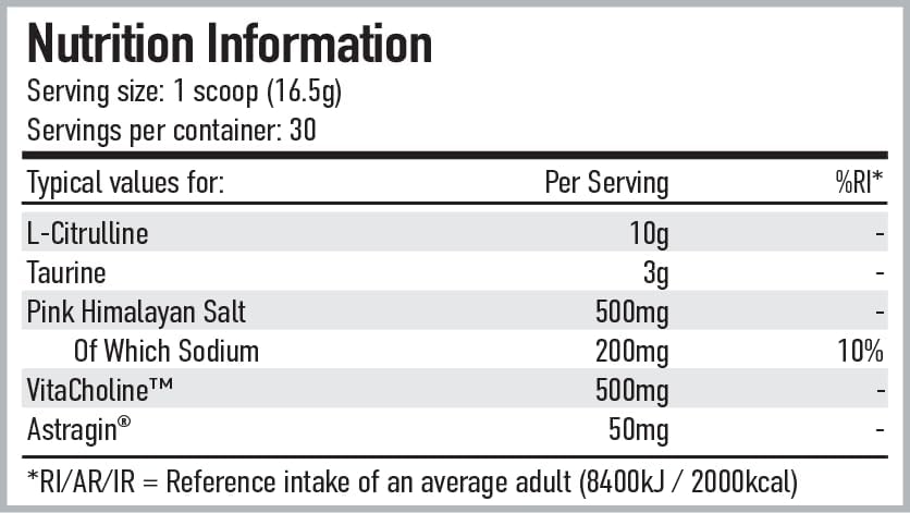 L-Citrulline, Taurine, sel rose de l’Himalaya, VitaCholine™, AstraGin®.