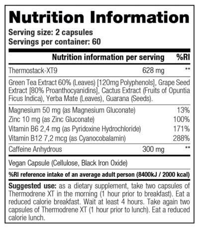 Le positionnement de Thermodrene XT Stacker2 repose sur une formule stimulante construite autour de plusieurs ingrédients mis en avant par la marque. La page produit cite notamment les proanthocyanidines, le yerba maté, la caféine, le guarana, le thé vert avec EGCG et polyphénols, ainsi qu’un extrait de cactus présenté pour le contrôle de l’appétit. La formule contient également du magnésium, du zinc et des vitamines B, dans une logique de soutien pendant les phases où l’organisme est davantage sollicité.